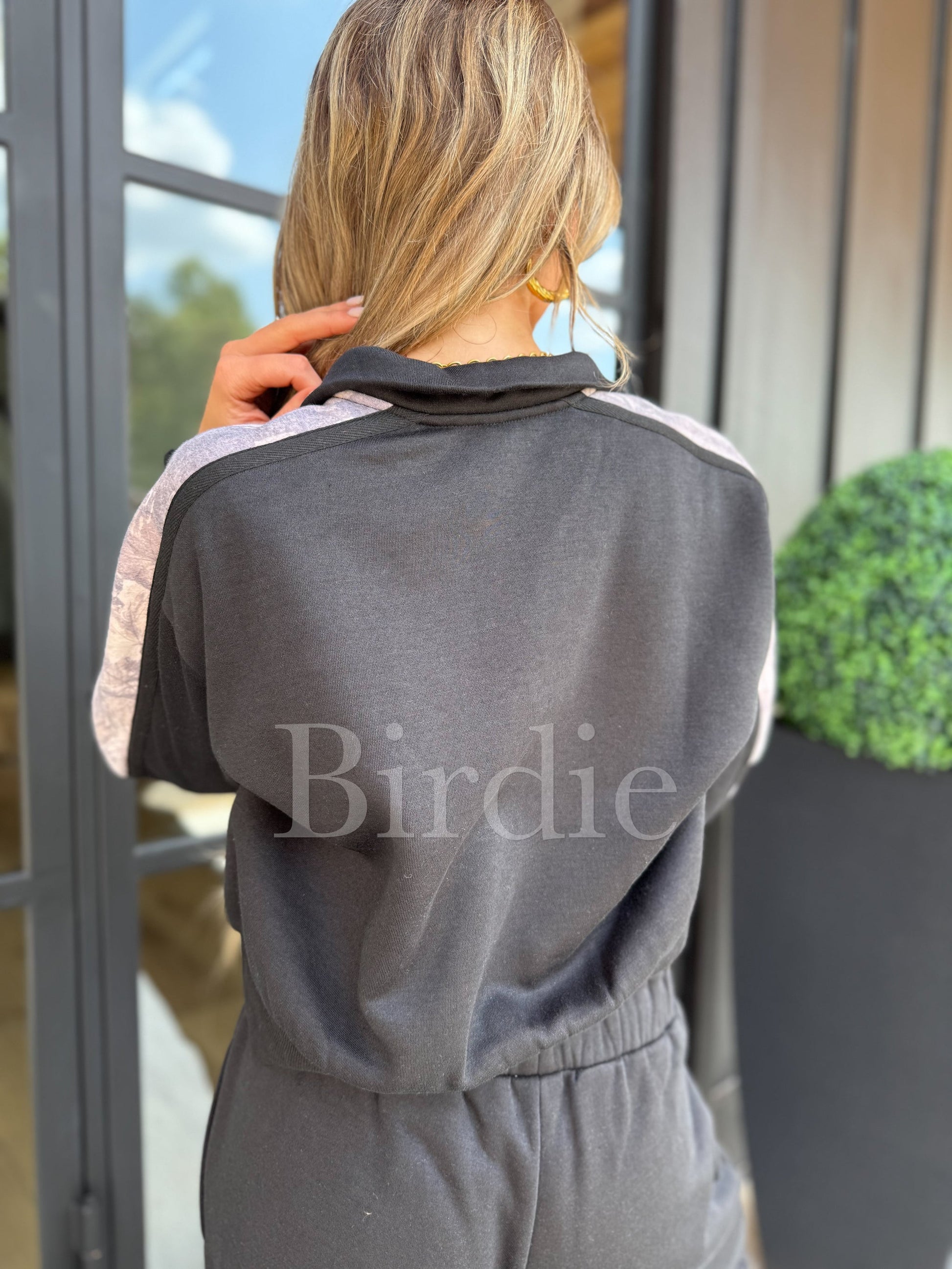 Effortless style meets everyday comfort in this sleek two-piece black set. Camo along the arm of the top and waist band of the pants.